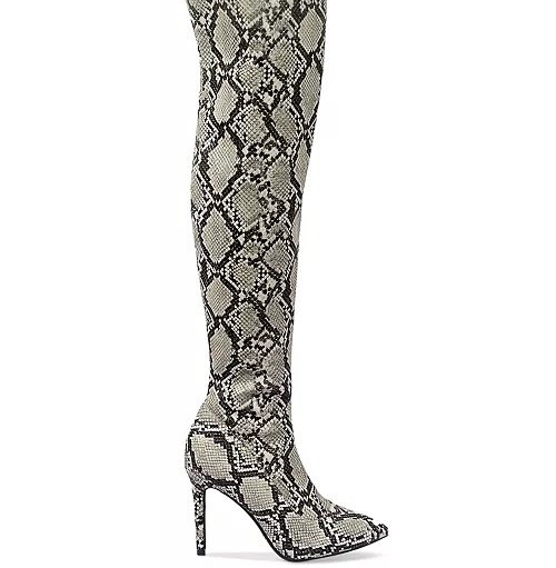 Up next, this is my go to look for mini skirts. I love wearing mini skirts and thigh highs all fall and winter. It's such an easy look, but super cute. I paired this with my pink zipper mini skirt from Target and some Steve Madden over the knee boots. Since the bodysuit is white, you can pair it with any mini skirt in your closet. If you're not a fan of snakeskin, pair it with a black boot and accessorize. If you want, add a colored or flesh tone tight. I picked this mini skirt because it is corduroy and added some texture to the look. This is the perfect outfit for a night out with the girls or brunch.