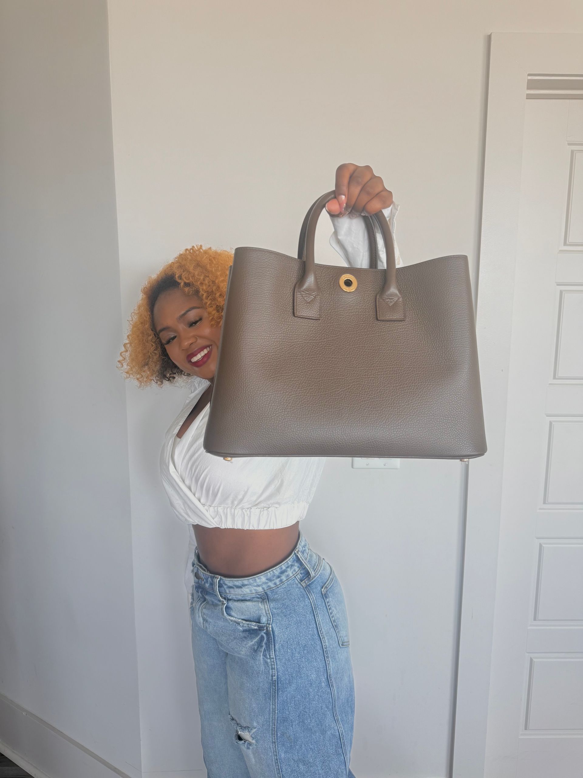 My mom actually bought me a new bag while she was traveling, and they had both a green and a black option. My first instinct was to choose black, but I changed my mind and went with green. It is an olive green but baby steps. And honestly, that small decision unlocked something in me. Green can still feel neutral, but it added just enough color to make a difference.